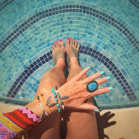 Fashion blogger Ibizabohogirl wearing feather bracelets