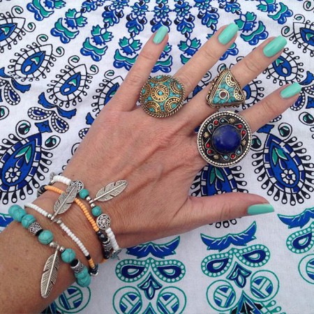 Fashion blogger Ibizabohogirl wearing feather bracelets