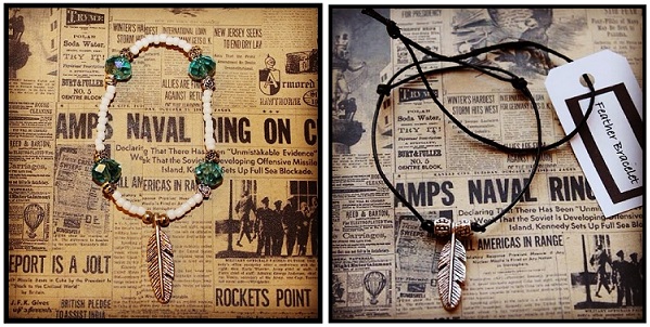 Dakota Bracelet: vita seed beads, turkosa glaspärlor och fjädern i metall